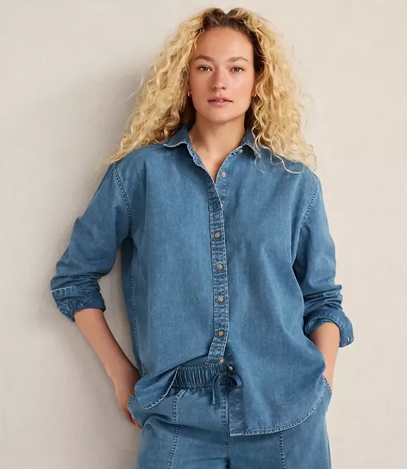 Haven Well Within. A thoughtful collection of lounge, sleep home and lifestyle essentials your trusted resource for all things wellbeing. Say hello to The Daily Shirt. This perfectly oversized button - down shirt is a new closet must - have for its everyday wearability and effortless style. Plus: it's woven from 100% organic cotton denim for the perfect blend of structure and comfort. For a complete set, style it with the matching denim pants or wear it with your favorite lounge pants., Hit: Hits below hip, Imported:, Length: 28"long, Fabrication: 100% Organically Grown Cotton, Garment Care: Machine Washable Loft Haven Well Within The Daily Shirt in Organic Cotton Denim Size 2XS Indigo Wash Women's by Loft Size Regular - 2XS Indigo Wash Women's V - Neck, Long Sleeve Shirts Tops Casual 100% Organically Grown Cotton Machine Washable