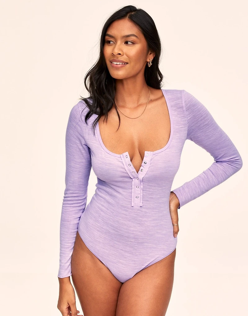 The Havyn bodysuit is a lavender-hued long-sleeved one-piece with a deep scoop neckline, front snap closure, and two-snap bottom closure. The soft knit fabric and pearled edge finish make this the perfect lounge piece. (Available in sizes XS-XL.)