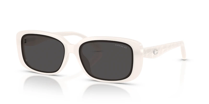 Step into sophistication with the Coach HC8444D CBY86 sunglasses, inspired by the iconic design of the Pillow Tabby bag. These full-rim rectangular frames, crafted from nylon and propionate, showcase quilted details and a metal sculpted C logo for bold elegance. The sleek white Coach sunglasses beautifully contrast with the classic grey lenses, delivering a fashion-forward pop of milky charm. Designed with sunglasses' low bridge fit for added comfort, these elevated shades are perfect for making a premium style statement.
