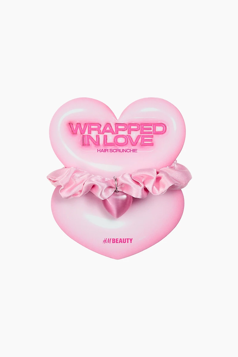 Scrunchie in shiny satin with a heart-shaped charm in plastic.