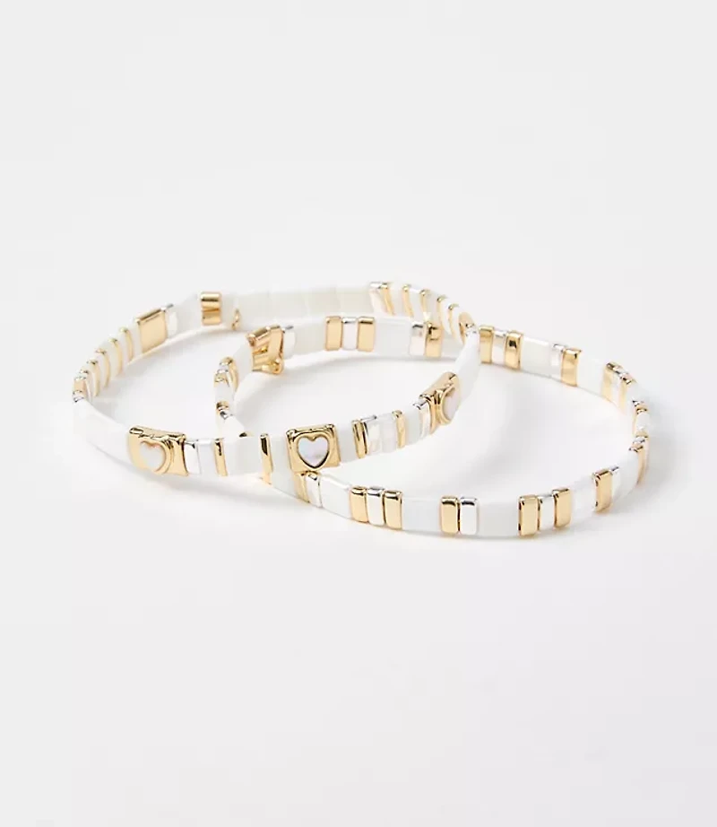 Strung with luxe mother of pearl and metallic beads, this heart - studded bracelet set whisks any look into wanderlust - pretty territory. 2 1/4"diameter., Imported: Loft Heart Chicklet Bracelet Set Mother Of Pearl Women's by Loft Size Regular - One Size Mother Of Pearl Women's Bracelets, Jewelry