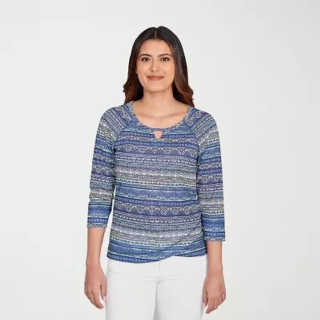 Alfred Dunner Saratoga Springs Womens Keyhole Neck 3/4 Sleeve T-Shirt