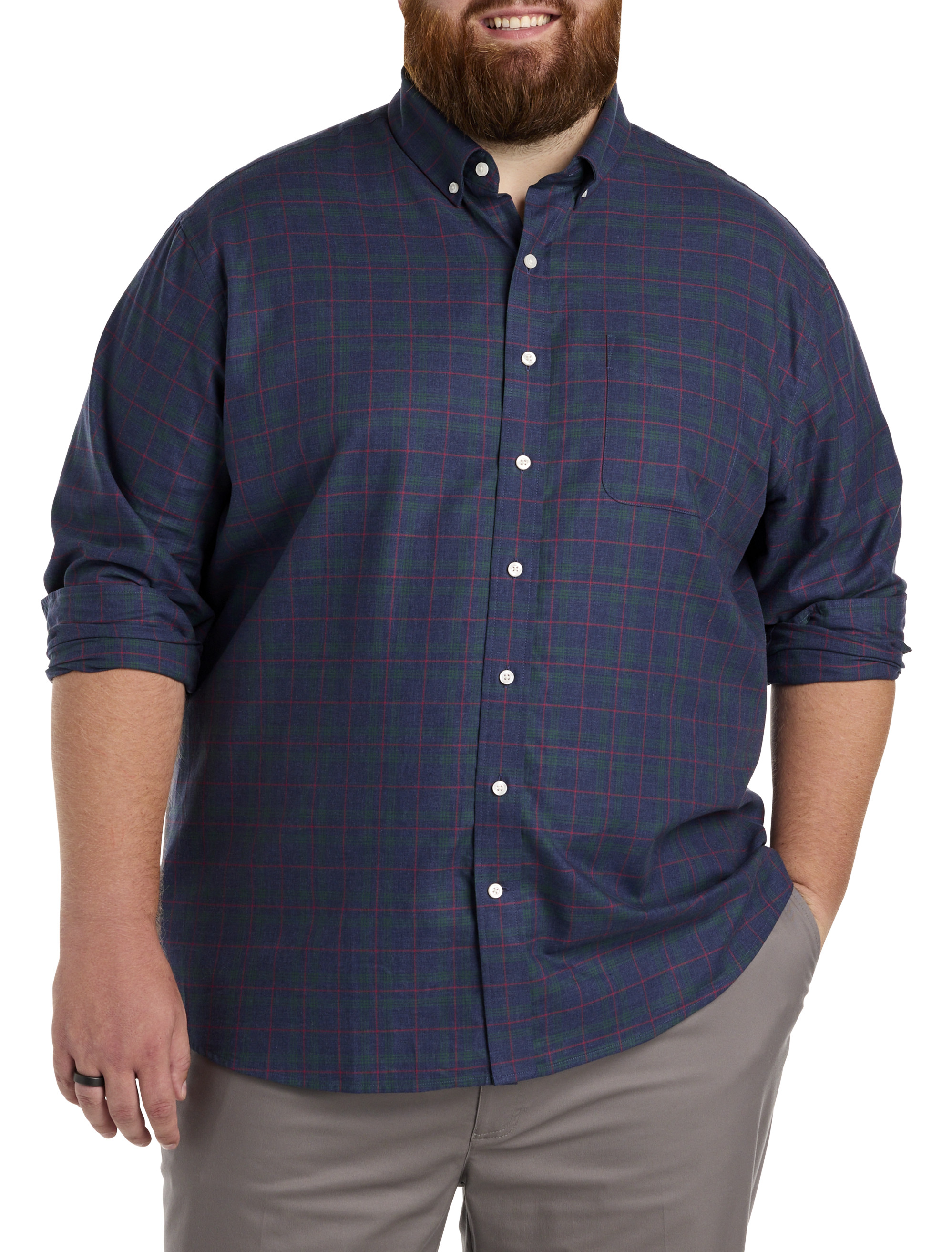 Crafted of soft cotton twill in a heathered plaid pattern, this button-down sport shirt will take you from work to weekend in polished style. It's designed at DXL with proper proportions for Big and Tall guys and a roomy, comfortable fit that allows for the freedom to move without restriction. Dress it up with a jacket and tie or wear it casually with jeans and a sweater. It's truly that versatile.