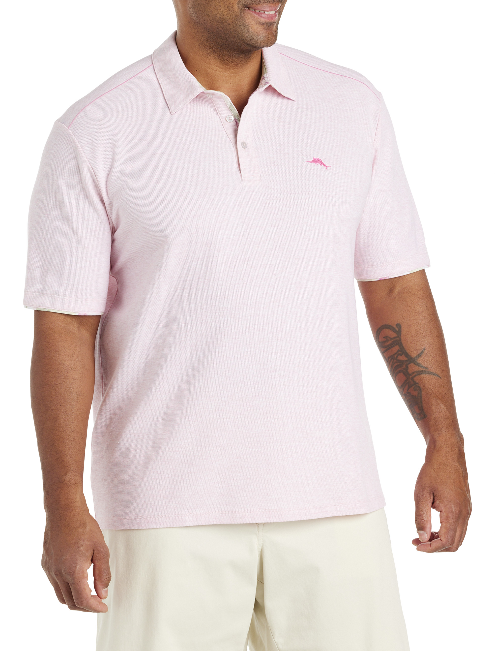 From court to clubhouse, you deserve comfort, mobility, and of course, a polished sense of style. Featuring woven trim with a signature heritage print for Breast Cancer Awareness Month, this pink-hued performance polo shirt from Tommy Bahama is sure to enliven your wardrobe. Finishing details like floral trim at the neckline and sleeve cuffs, as well as the signature embroidered marlin at the left chest, give it its sophisticated look.