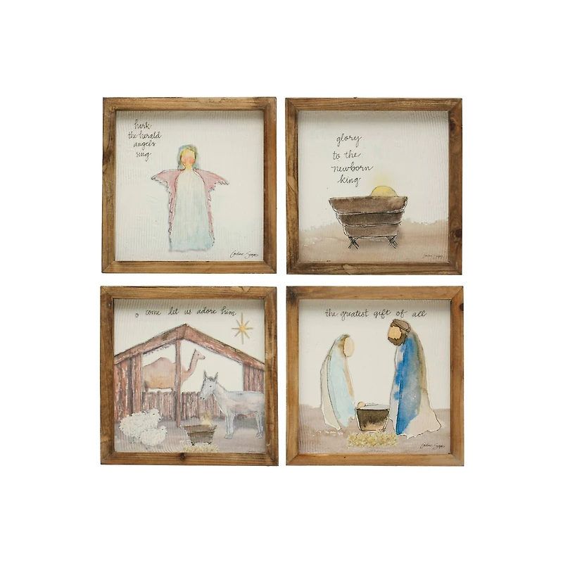 Experience the captivating beauty and heartwarming message of the "Peace on Earth" holiday décor collection. Inspired by enchanting winter night skies and the spirit of giving, this collection embodies the timeless traditions of the holiday season. Each décor item features traditional silhouettes and nativity themes, rendered in neutral hues with versatile organic styles that seamlessly blend with any interior design scheme. Gilded accents add a touch of luxurious elegance, evoking the beauty and magic of the holidays. The collection is a true celebration of peace, love, and joy, creating a serene and enchanting ambiance. Whether decorating your own home or looking for the perfect gift, this collection is sure to bring a sense of warmth and comfort to any space. This set includes four square wood-framed wall décor pieces with unique designs, perfect to add a rustic and charming touch to any room. Add a touch of magic to holiday displays with our stunning collection of wall art, including charming engravings, elegant signs, and playful prints, perfect for celebrating the season in style. Each holiday décor item is carefully crafted with the utmost attention to detail to ensure that it will be cherished for years to come.Details:Multicolor8.25" x 0.75" x 8.25" eachSet of 4 framed décorFirwoodFor indoor use