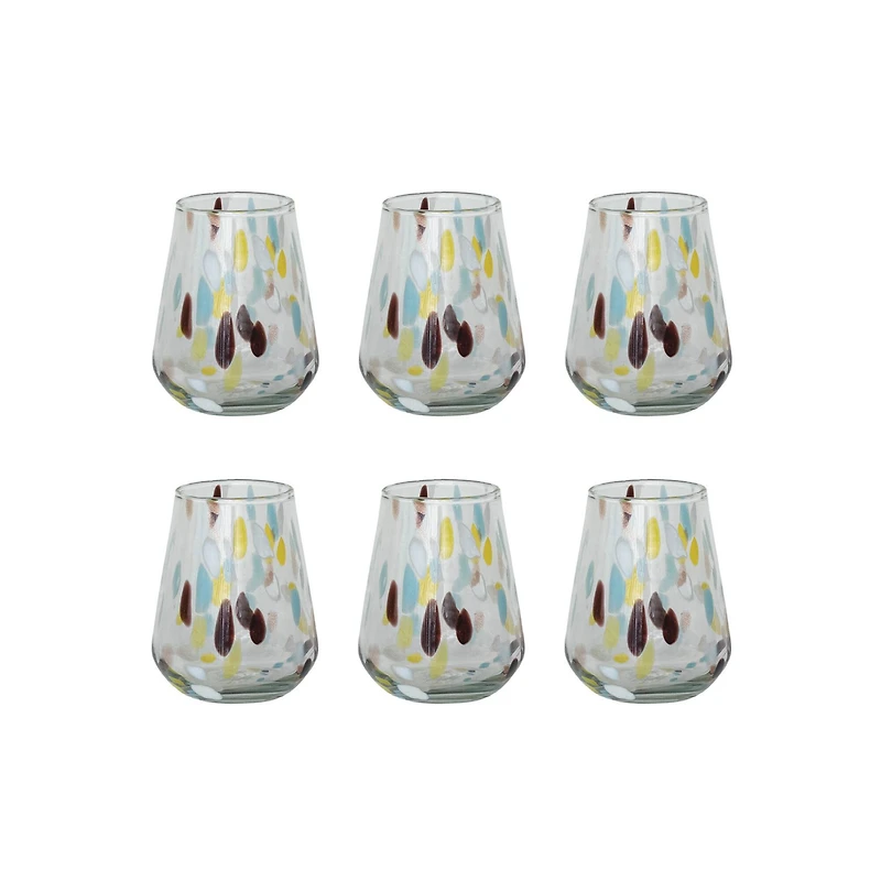 This set of six round blown confetti drinking glasses brings a burst of joy to any gathering. Holding 12.5 ounces each, these glasses are perfect for serving various drinks. The round shape and playful confetti design add a touch of whimsy to any occasion, so whether used for a casual family dinner or a festive party, these glasses are sure to delight guests and elevate any table setting.Details:Multicolor confetti pattern3.5" x 3.5" x 4.25" glass size12.5 oz. liquid capacity6 glassesHand-blown glass