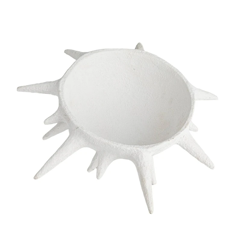 This Spike Accent Volcano Finish Bowl is a marvel of contemporary design. Standing at 16.25" long, 15.5" wide, and 5.75" high, it commands attention with its dramatic silhouette and textured surface. The base is 9.5" round and 4" deep , providing stability and a solid foundation for this striking piece. The matte white finish, reminiscent of volcanic ash, contrasts beautifully with the bowl's aggressive form, softening its presence and allowing it to blend seamlessly with a variety of décor styles. Whether used as a standalone art piece or as a functional bowl to hold cherished items, it's a versatile addition to any home seeking a touch of the extraordinary. With its robust construction of resin and stone powder, it's not just visually striking but also built to endure.Details:White16.25" x 15.5" x 5.75"9.5" x 4" base sizeResin and stone powderFor indoor use