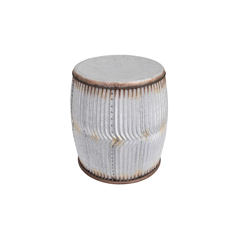 Anchor the design of a living space with a bold focal piece, or simply add touch of personal style to a spare room with an artfully crafted piece of furniture. This highly detailed stool can be used as a unique side table. The distressed, rustic finish of this cart makes it well suited for farmhouse and country styles, while the inclusion of uniquely corrugated galvanized steel sides make this table relevant in industrial and garden aesthetics as well.Details:Silver colored16.5" x 16.5" x 17.5"MetalFor indoor use only