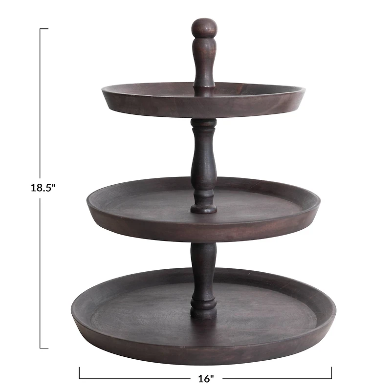 Create a customized arrangement of treasures and trinkets on a mantelpiece, bookshelf, or dresser for a personalized display full of color and texture. This farmhouse-inspired wood tray features three tiers of descending sizes in a dark finish.Details:Black16" x 16" x 18.5"3 tiersMango woodFood safeHand wash only