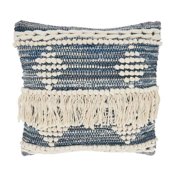 Blue Natural Chindi Fringe Cotton Pillow