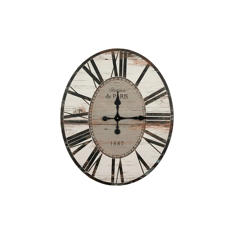 Don’t settle for a simple wall clock to keep you on time. Add this elegant wall clock to your home to add both French country style and function to your home. Inspired by the styles found in Provincial cottages and American country cabins, this lovely accent brings casual charm and unexpected elegance to your home. The large black Roman numerals and the matching black hands give this piece a touch of traditional charm, while the distressed wood detailing provide a pop of vintage elegance. This clock also showcases the typographic motif reading “Antiquite de Paris 1887” for added charm. Try hanging this lovely clock in your kitchen to give your space a pop of style and so you can keep your eye on the time while baking and cooking. To complement the style, add some framed vintage ads and culinary prints to your walls for a beautiful display.Details:Available in multiple colors24'' x 2.5'' x 29.5''Wood constructionFor indoor use