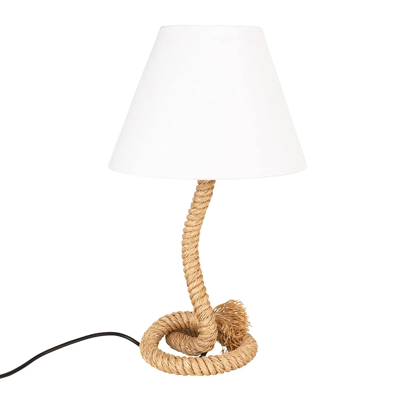 This Table Lamp is a beacon of coastal charm, with its body of brown manila rope and metal base. It stands 26.25 inches tall and extends, making it a substantial yet graceful addition to any room. Designed to be versatile, it's equally suited for a living room end table or an outdoor patio, bringing the relaxed vibe of the seaside to any space.Details:White and neutral15" x 26.25"7-foot cordRequires a 9W LED bulb Recommended 9W LED bulbMade of woven Manila rope and solid metalFor indoor or outdoor use
