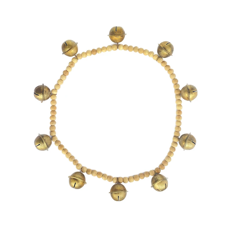 This wood bead and metal bell garland intertwines the simplicity of nature with the sophistication of antique gold. Each bead and bell is thoughtfully selected to create a garland that resonates with a sense of history and charm. At 33 inches long and 3 inches high, it's a versatile piece that can adorn a mantelpiece, grace a doorway, or add a festive note to a holiday table.Details:Antique gold (colored) finish2.75 ft. garlandMade of natural wood beads and metalFor indoor use