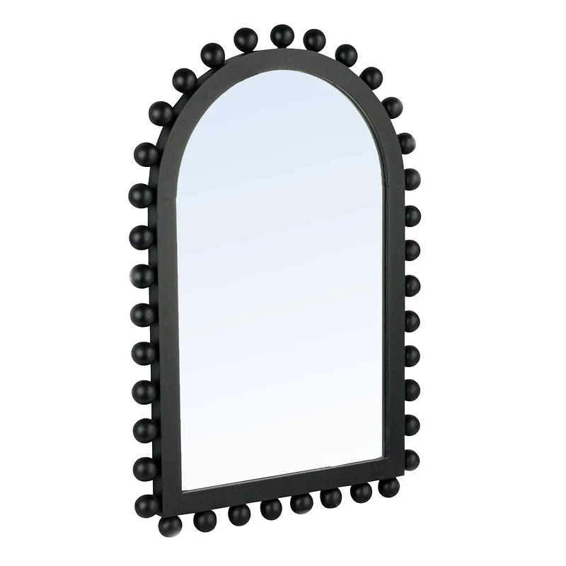 This firwood framed arched wall mirror is a versatile addition to any home. The black wood frame, with beaded edge, adds a touch of organic texture and warmth. Designed to align with Boho, Southwestern and Transitional décor, the mirror comes equipped with a reliable hanging mechanism, ensuring it's both a focal point and a functional piece in the home. Whether placed in an entryway, living room or bedroom, it's sure to enhance the ambiance with its understated beauty and reflect your unique style.Details:Black frame with mirror finished glass20.75" x 31.5"Glass, MDF and woodHardware attached for hangingRecommended for indoor use only