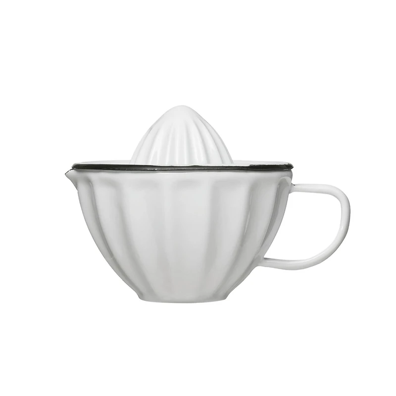 Fresh orange juice, sweet lemon, and juicy pineapple can be squeezed on this white metal juicer. Place the desired fruit on top and push down over the cone shape while the juice slithers through the holes to the container below. Enjoy the choice flavor of fresh squeezed juice in the comfort of home.Details:White and black4" x 4" x 4"Enamel
