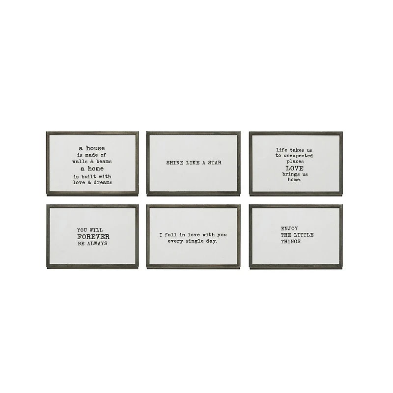 Six metal frames each hold a different phrase to be enjoyed. If desired, the phrases can be replaced with precious photos of family and friends. To create a unique setting, keep the 3favorite phrases and place photos in the other 3. Mix them together on a tabletop for an enjoyable combination of media.Details:White with black text in gray frame6.1" x 2.55" x 3.93"6 framesMetal, glass, and canvasFor indoor use