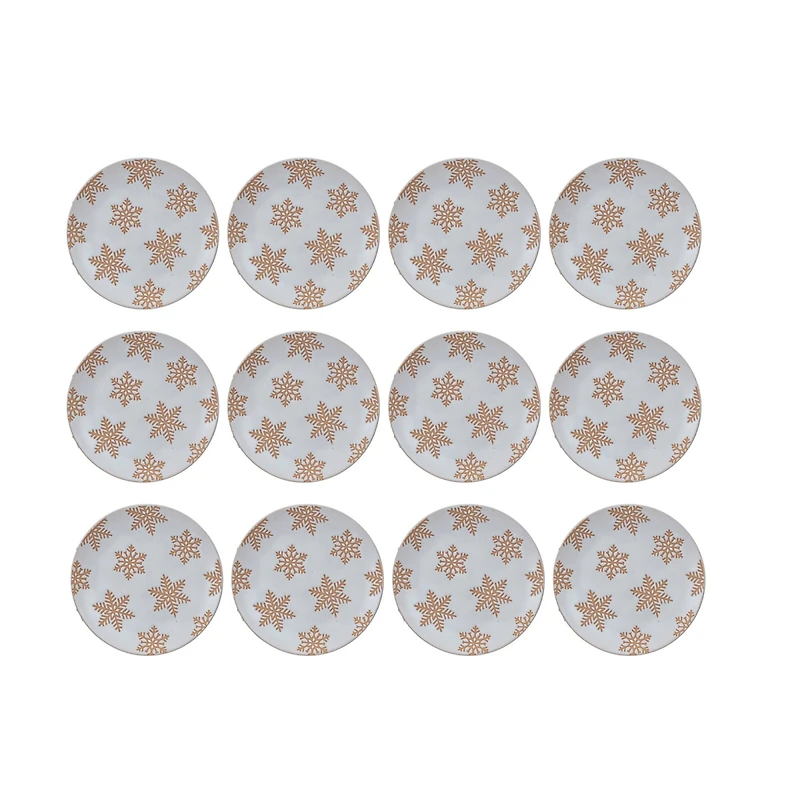 This set of 12 stoneware snowflake plates is a beautiful and functional addition to the home. They feature wax relief snowflakes that create a textured and contrasted effect, and a reactive glaze finish that gives them a unique and varied look. Each plate is slightly different, making it a one-of-a-kind item. The plate can be used for serving food, snacks, or desserts, or as a wall hanging or a gift. The plates are made of stoneware, which is a durable and high-quality material, with a white and orange color scheme that adds a touch of warmth and sophistication. It is easy to clean and dishwasher-safe. This stoneware snowflake plate is a wonderful gift for anyone, especially during the winter or holiday season.Details:White and orange with reactive glaze finish6" x 6" x 0.75" eachSet of 12 platesFood-safeDishwasher safeStoneware