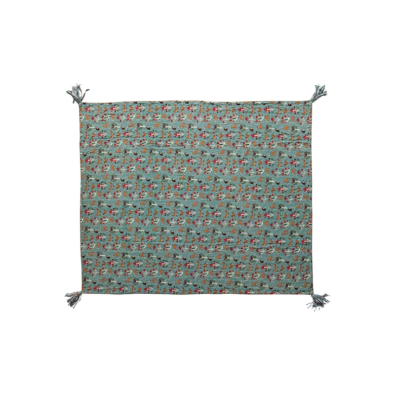 Add warmth and charm to your space with this green hand-woven cotton-printed quilt. It features a woodland flora and fauna pattern, kantha stitch, blanket stitch edge, and tassels. It is sure to lend a cozy style to your sofa, bed, or chair.Details:Green60" x 50"Made of cotton and polyesterFor indoor use
