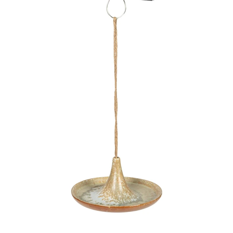 Attract feathered friends to the outdoor space with this stoneware bird feeder with jute hanger. This lovely bird feeder has a tan reactive glaze that gives it a unique and rustic look. The round shape and the large opening make it easy for birds to access the seeds inside. With the jute hanger, you can hang it from a tree branch, a hook or a fence.Details:Tan3.25" x 3.25" x 6.75"StonewareFor indoor or outdoor use