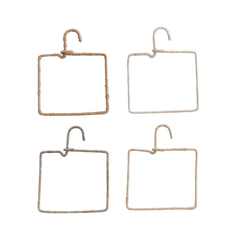 The aluminum and natural fiber wrapped hanger, available in four natural colors, offers a sleek and versatile design for any convenience. The hanger is made of aluminum and raffia, giving it a modern and natural look. The hanger has a hanging mechanism that allows it to be hung vertically on any wall.Details:Brown8.5" x 7"4 piecesMetal and natural fiberFor indoor use only
