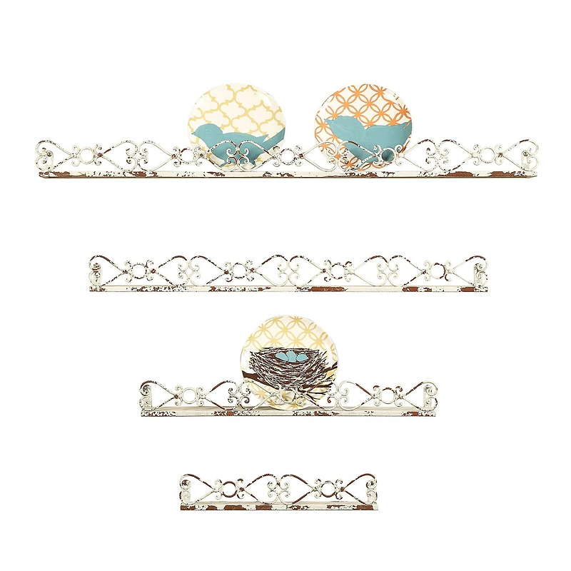 You can never have too much shelf space. Add this set of four ledges to your décor and have a lot more room to place special items for display. Have fun arranging them on the wall large to small, small to large, side by side or scattered around. Details:Distressed CreamSmall ledge: 6.25"Medium ledge: 24"Large ledge: 39.78"X-Large ledge: 43.5"4 ledges (plates and decor sold separately)Iron
