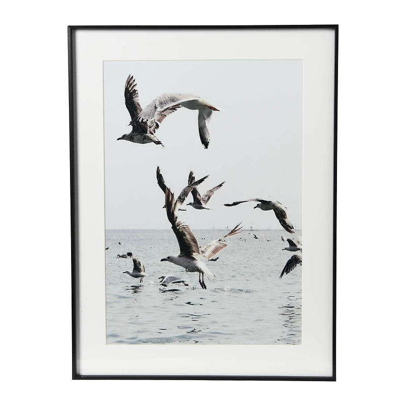 Modern coastal inspired seagulls in flight print adds an elegant tough to any dining or living space. Sleek design and an elevated nautical theme make it the perfect accent for your home away from home. Photo realism print features imagery of seagulls in flight over a shimmering ocean with gallery matted black metal frame.Details:Blue, white and black24" x 18"Metal, glass and paperFor indoor use only
