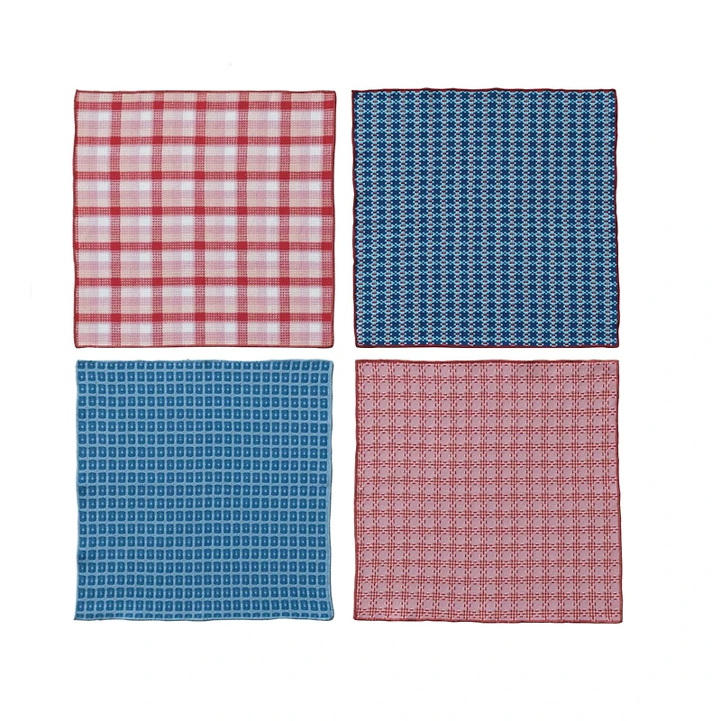 Add a splash of color and pattern to every dining experience with our charming patterns 4-piece cotton napkin set. Woven from high-quality cotton, these 18" square napkins feature a variety of delightful designs, making each piece unique. Their generous size provides ample coverage, while the material ensures they are soft to the touch and easy to clean. Ideal for settings that range from the farmhouse to the French countryside, these napkins are versatile enough for everyday use yet elegant enough for special occasions. Elevate the table décor with this exquisite set that blends functionality with a timeless aesthetic. A tapestry of vibrant hues and intricate patterns, each napkin is a canvas that celebrates artisanal charm. A perfect complement to farmhouse, cottage, and French country aesthetics, these napkins bring a touch of rustic elegance to any table setting. Made of pure cotton, these napkins promise durability and softness, becoming more absorbent with each wash. Details:Includes assorted red and blue patterns18" x 18"Set of 4Cotton