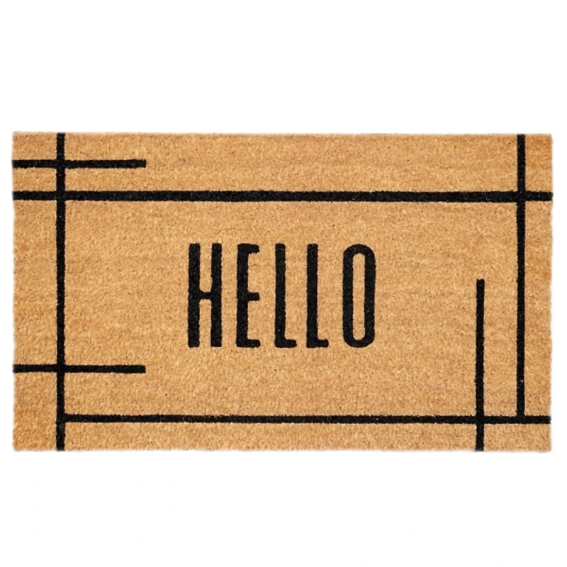 Give guests a friendly welcome with this Hello Natural Linear Doormat. Its oversized design will cover a large area and help keep dirt out of your home! Doormat measures 36L x 24W x 0.6H in. Crafted of coir with a vinyl backing Features the word "Hello" Linear design Hues of brown and black All-season, colorfast, and weather tolerant Safe for outdoor use Care: Vacuum or sweep clean. This item is available at Kirklands.com only, not available in stores. Please note: this item cannot be shipped to APO/FPO addresses.