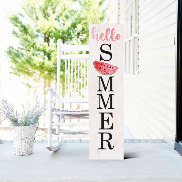 Get ready for the sunny season with this Hello Summer Watermelon Porch Board! It will add a bright, cheerful touch to your front entrance or backyard barbecue gathering! Board measures 9.25L x 1W x 48H in. Crafted of wood Features the text "Hello summer" Watermelon accent Hues of white, black, pink, red, and green Outdoor safe Care: Dust with a soft, dry cloth. This item is available at Kirklands.com only, not available in stores. Please note: this item cannot be shipped to APO/FPO addresses.