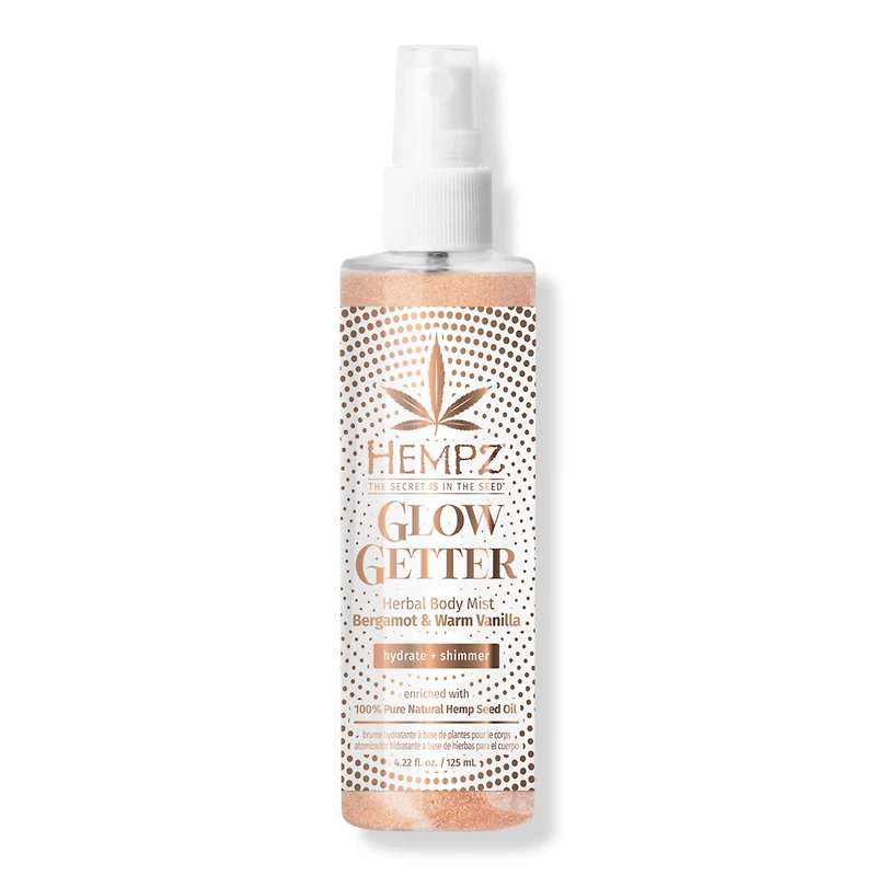 GLOW GETTER SHIMMER MIST 4.2OZ. Benefits: Hydrates skin without feeling sticky or oily. Makes skin shine. Features: 100% Pure Hemp Seed Oil. :