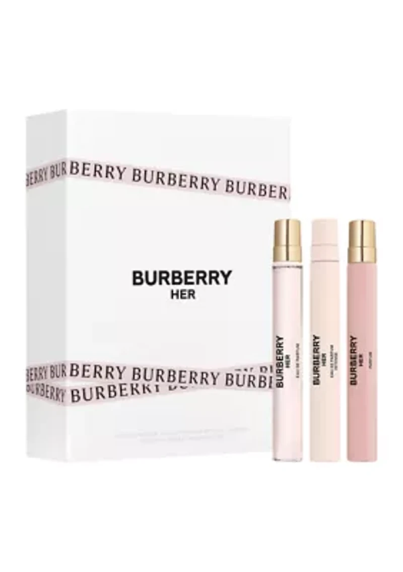 With love, offer a Burberry Her gift set. This Burberry Her gift set includes Burberry Her Eau de Parfum, Burberry Her Eau de Parfum Intense, and Burberry Her Parfum: a captivating blend of ambery, gourmand, and fruity scents in travel sprays ideal for both day and night. Burberry Her Eau de Parfum is the first gourmand fragrance with a British twist by Burberry. A burst of red and dark berry notes is lightened by a luminous white woody accord. Burberry Her Eau de Parfum Intense amplifies Burberry Her’s signature scent with fruity notes of wild strawberry and orange blossom, balanced with warm, ambery wood. Burberry Her Parfum opens with mellow notes of cherry, enriched by a warm ambery accord and vanilla absolute for a gourmand, sophisticated and irresistible fragrance. Fragrance Family: Fruity Scent Type: Gourmand, Fruity Key Notes: A burst of red and dark berry notes are lightened by a luminous, white woody accord. This set includes: Burberry Her Eau de Parfum Travel Spray 10ml (0.33oz) Burberry Her Eau de Parfum Intense Travel Spray 10ml (0.33oz) Burberry Her Parfum Travel Spray 10ml (0.33oz) Imported