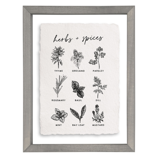 Cook up something special with this Herbs and Spices Framed Wall Plaque. Its adorable design will look lovely hanging on your kitchen wall or atop your counter! Plaque measures 11L x 1.5W x 14H in. Crafted of wood, plexiglass, and papier mache Gray frame finish Reads "herbs + spices" Features a collection of labeled herbs Printed on papier mache encased in plexiglass Hues of black and white Weight: 1.25 lbs. Hand-crafted Hangs from back-mounted hardware Printed in the USA Care: Dust with a soft, dry cloth. This item is available at Kirklands.com only, not available in stores. Please note: this item cannot be shipped to APO/FPO addresses.