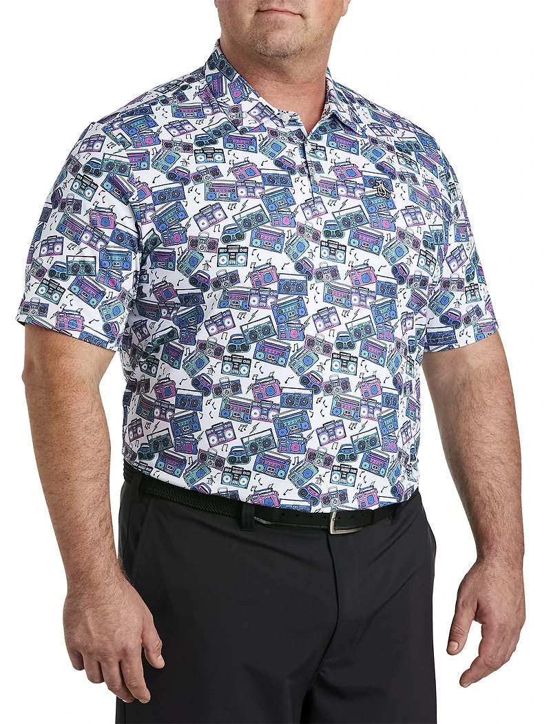 When you want to bring "the boom" to your golf game, this Original Penguin polo shirt is the perfect choice. Channeling a retro vibe with its big boombox print pattern, it's a fun new take on the more traditional golf styles of the past, finished with Pete the Penguin at the left chest. It's soft, lightweight and breathable with an almost silky texture. Sustainably made in a recycled, stretch fabric for a smaller ecological footprint, it offers supreme comfort and the freedom to move without restriction. Built-in moisture-wicking technology keeps you feeling cool and dry so you can bring the noise and your A-game. You'll only find here at DXL in proper proportions and a flattering fit for Big and Tall guys.