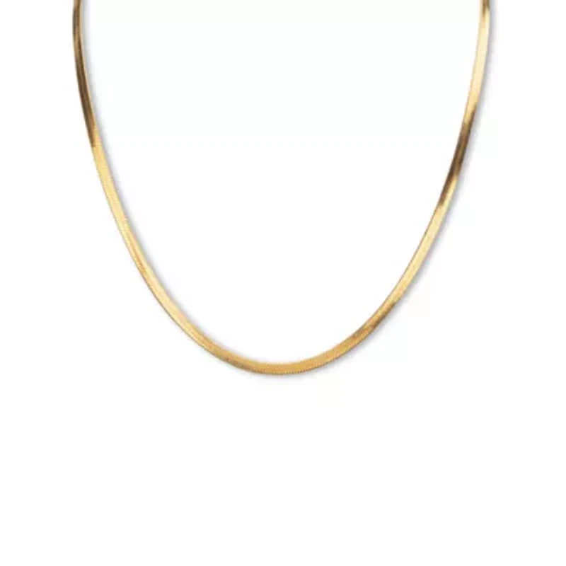 You'll look like you're dripping with gold! The tightly-woven chevron pattern creates a classic herringbone chain necklace. This simple look is perfect for the minimalist in your life. 3mm width. 18" length with a 2 1/2" extender. Gold Ion-plated stainless steel. Tarnish free and waterproof!Gold Ion-Plated Stainless Steel, so color and sheen last for decades without damage and it's hypoallergenic (won't turn your skin green like other plating methods can).Dimensions: 3 mm wide x 18 inches long x 0.5 mm high, plus 2 1/2 inch extensionIncludes gift box and drawstring pouchGold Ion-Plated Stainless Steel, so color and sheen last for decades without damage and it's hypoallergenic (won't turn your skin green like other plating methods can).Dimensions: 3 mm wide x 18 inches long x 0.5 mm high, plus 2 1/2 inch extensionIncludes gift box and drawstring pouch Lobster closure Polished finish Warranty available China Imported Product Specifications 0.14 in x 18 in x 0.12 in, 18" length Material & Care Metal, Stainless steel Clean with a soft cloth.