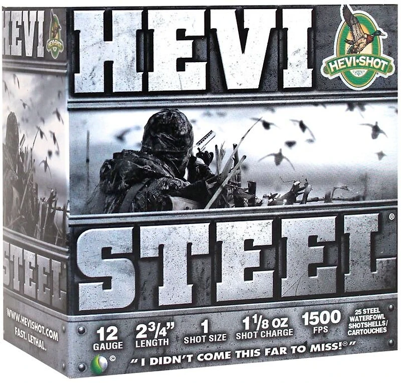 Take aim at birds on your next hunt with the HEVI-Shot HEVI-Steel Waterfowl 12 Gauge Shotshells. These shotshells are designed with a high-density pattern for reliability when you're hunting waterfowl. 25-round box. Made in USA.