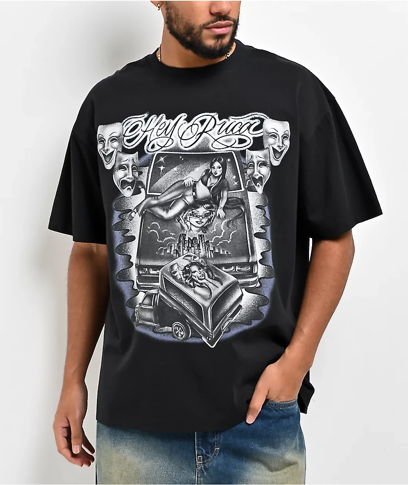 Add streetwear style to any outfit with the Mini Truck t-shirt from Hey Ruca. Arriving in a black colorway, the top features artwork on the front of several beautiful women surrounded by icons of SoCal culture including a lowrider and city skyline.
