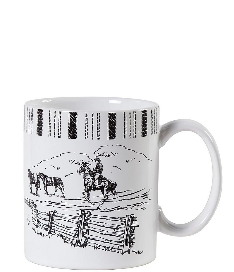 From the HiEnd Accents Ranch Life Collection by Paseo Road, this mug set features: Our Ranch Life Horse Mug is a playful way to add Western charm to your dining table. In a versatile black-and-white colorway, this mug features a cowboy wrangling horses, finished with a mattress ticking stripe rim. Complete a whimsical, rustic dining ensemble when you coordinate with other pieces in our Ranch Life Collection. Set of 4 mugs Ceramic Cowboy wrangling horses decal Ticking stripe detailing Dishwasher and microwave safe Approx. 4.53" H x 3.8" D Capacity approx. 20-oz. Imported.