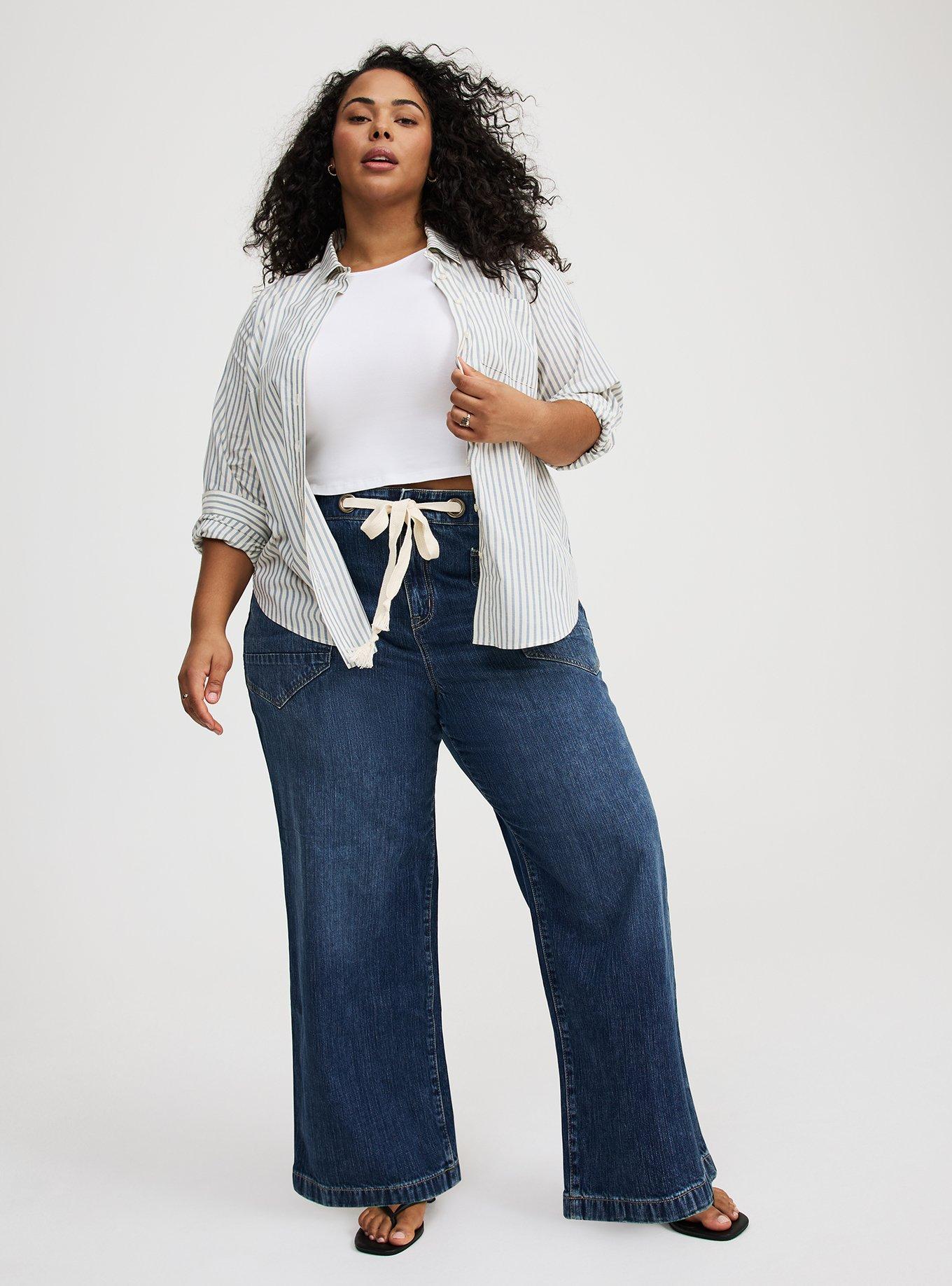FIT High rise. Loose straight fit from thigh to ankle. We recommend buying your true size for a slouchier fit. Size down for a closer fit. Pull-on design. Inseams: Short 28"", Regular 30"", Tall 32"". MATERIALS + CARE Rigid+Stretch Denim: Best of both! Constructed with a rigid denim front and a stretchy denim back. Front of Jean Rigid Denim: Stretch-free for an authentic old-school look and feel. Stretch Level: None 100% cotton. Back & Waistband of Jean Vintage Stretch Denim: Classic denim feel, perfect amount of stretch. Stretch level: Medium. 98% Cotton, 2% Spandex. Machine wash cold, inside out. Tumble dry low. Imported. DETAILS Tie-waist front with zipper & button. 4-pocket design. WHY WE LOVE IT Even more relaxed than your favorite straight-leg jeans with a cool tie-front design.