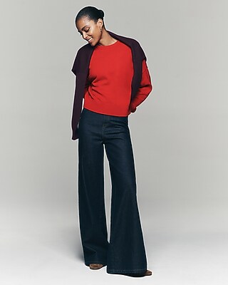 These wide leg jeans feature a belted high rise waist and a rinse dark wash. A wide leg shape is designed to fall straight down from the hip in an exaggerated length to give a long and lean appearance.
