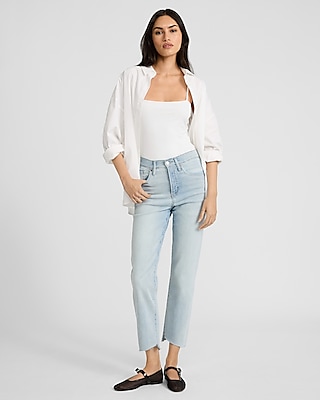High Waisted Light Wash Raw Hem Straight Ankle Jeans
