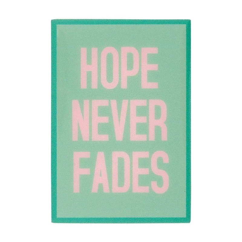 This magnet features a soothing mint green background with bold, pink lettering that reads "Hope Never Fades." The contrasting colors make the message stand out, ensuring that it catches your eye and delivers its motivational message whenever you glance at it.