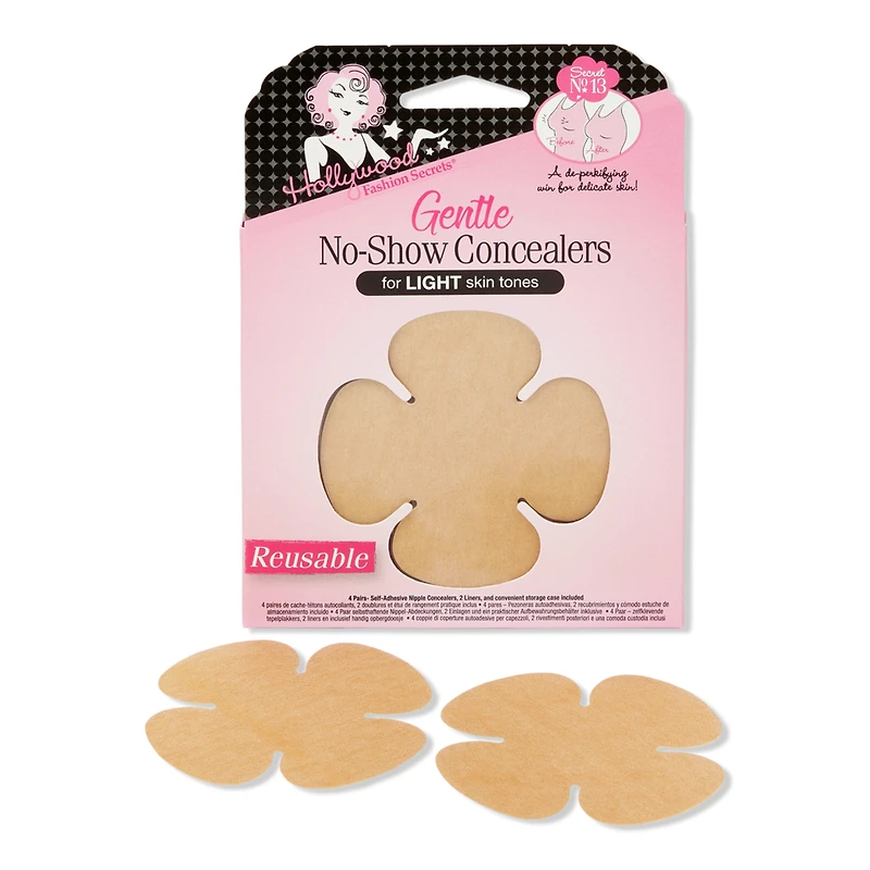 GENTLE NO SHOW CONCEALERS DARK. Benefits: Ideal for individuals with delicate or sensitive skin. Perfect under t-shirts, sheer tops, dresses & swimwear. Great for unpadded bras or braless fashions. For anytime you need to "de-perkify". Features: Soft silicone adhesive designed for the most delicate skin types. Medical quality, hypo-allergenic: Won't irritate skin. Convenient, reusable product. 2 liners & storage case included. :