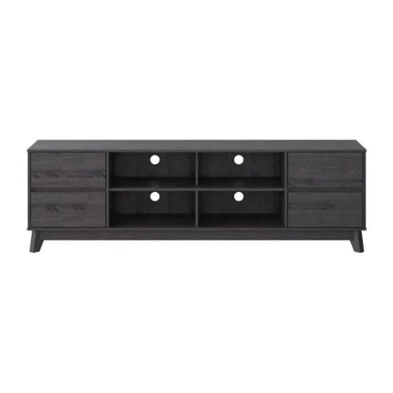 Take your living room to the next level with this stylish modern tv stand. Made with flared wood legs, four drawers, and four open shelves for a mid-century modern appearance. This entertainment center creates additional storage space in your home for media, electronics, accessories, books, or decor. The beautiful rich wood grain finish looks great in any aesthetic. This bench fits most Tvs up to 85" and is the perfect combo of classic colors and modern lines.