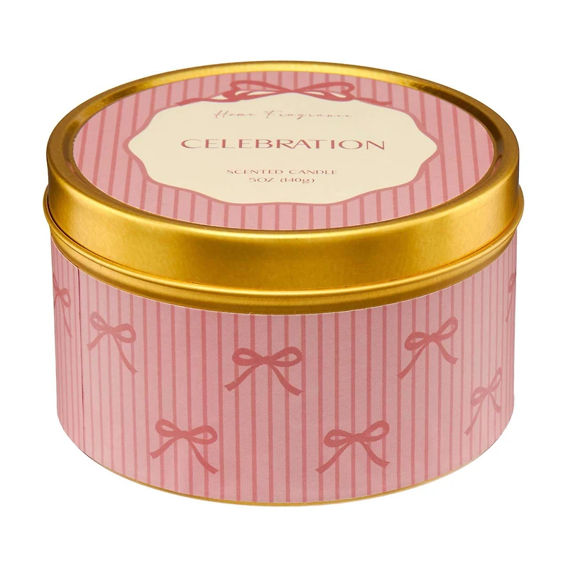 Elevate your home ambiance with the delightful Home Fragrance Celebration Scented Candle, a perfect addition to any room for creating a warm and inviting atmosphere. This charming 5 oz candle is housed in a beautifully designed pink tin adorned with delicate bows and subtle stripes, making it as visually appealing as it is fragrant.