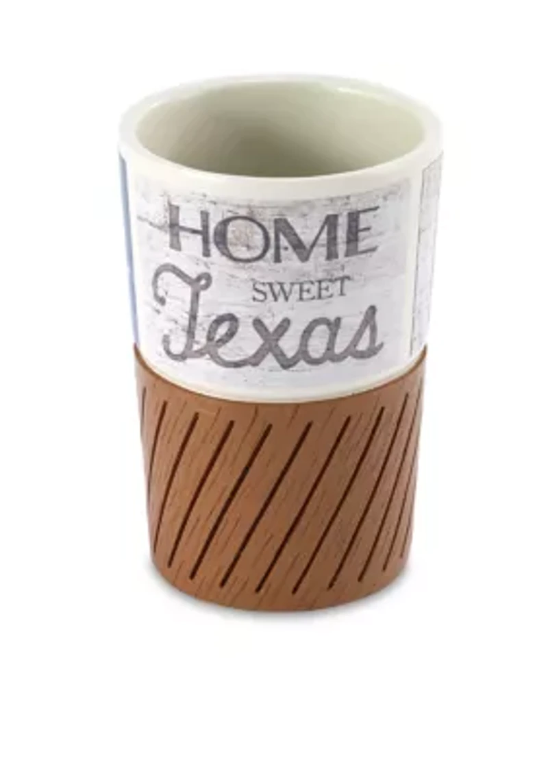 Showcase your love for your home state of Texas in your bathroom when you add this Home Sweet Texas Tumbler into the mix. The quality resin material and woodgrain look on the bottom will make this must-have your new favorite decor addition. Material Resin