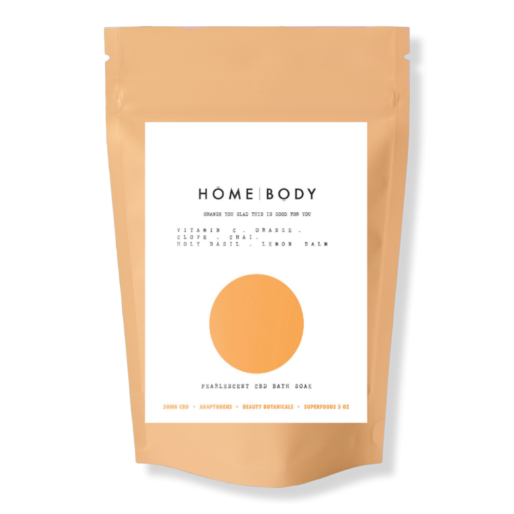 CBD BTH SK MN HLDY RNG Y GLD THS S FR Y. Benefits: Homebody's 4-in-1 Pearlescent CBD Bath Soaks are a blended bath oil, bath salt, bath bomb and bath soak that targets everyday instabilities like stress, moods, pain, balance and sleep for whole body wellness.. Made with third-party tested, organically grown hemp-derived full spectrum CBD, to combat sore muscles. CBD and Citrus Essential Oils soothe the senses for a bright, invigorating experience.. Soak for 30 minutes, enjoy the kaleidoscope effects of the bath water, let the rich herbs and minerals soak away any discomfort, allow your tiny pores to drink up all the good stuff and (literally) feel all your troubles (and sore muscles) fade away.. Made in the USA, free from artificial fragrances, paraben and phthalate free, made with biodegradable eco-friendly glitter. Key Ingredients: Phytocannabinoid Rich Hemp (CBD). Orange essential oils. Grapefruit. Holy Basil. Lemon Balm. Clove. Vitamin C. Magnesium. Scent Type: Bright citrus and clove.