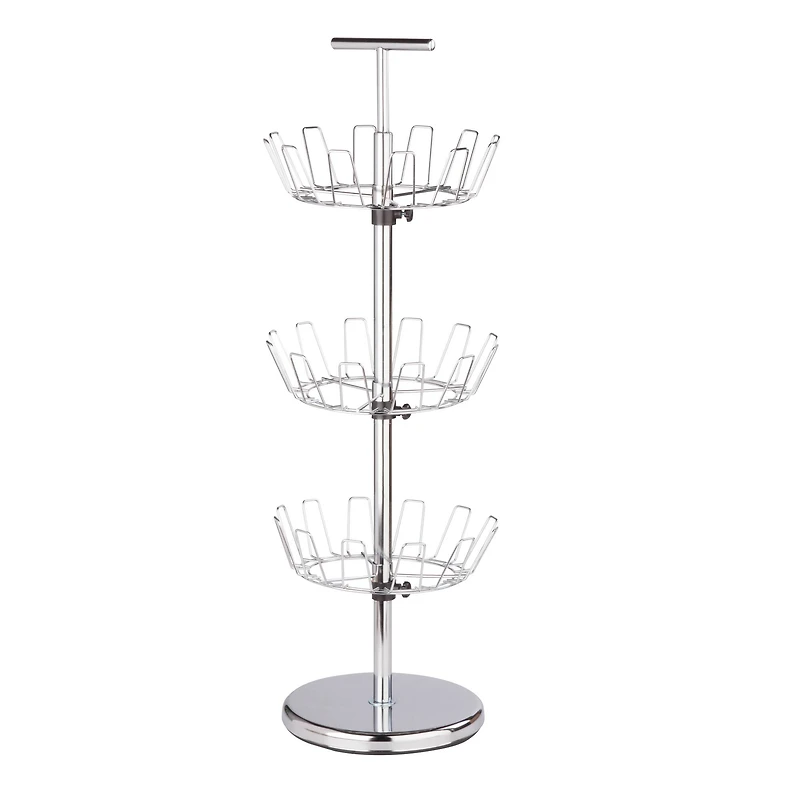 Go vertical and store up to 18 pairs of shoes on this 3-tier shoe tree. With only a single square foot of floor space required, you can reclaim your room and keep your shoe collection accessible and organized. All three levels revolve separately and adjust in height to accommodate small and large shoes, which gives you a flexible storage solution and easy access to every pair. Details:Chrome40" x 11.4"Some assembly required