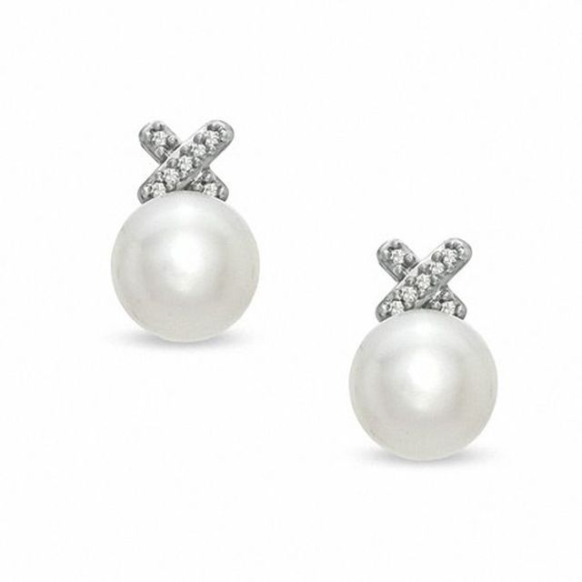 Honora 7.0-7.5mm Freshwater Cultured Pearl and Diamond Accent "X" Earrings in Sterling Silver