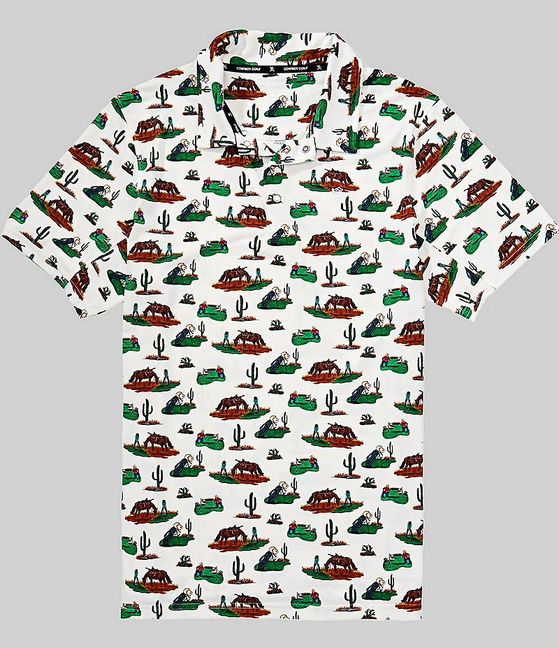From Hooey, this polo shirt features: Desert scenery, horse and cowboy character screen prints Cool-to-the-touch textured fabric Collared neckline Short sleeves Partial-snap placket Faux-pearl snap details "Hooey Golf" chest embroidery Athletic fit Premium performance meets everyday versatility with a western edge All direction stretch and articulated arm seams for maximum mobility Quick dry and moisture wicking UPF 30 sun protection Nylon/spandex textured fabric Machine wash/tumble dry Imported.