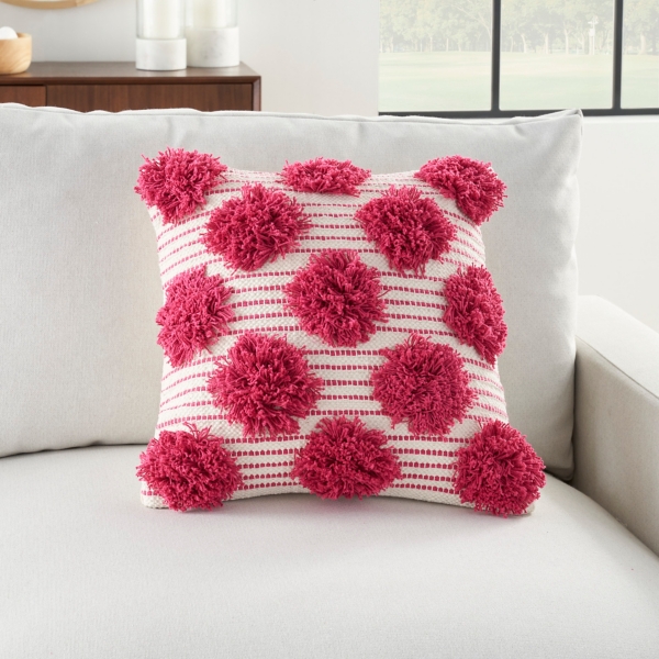 Deliver vibrant color and fun texture to your couch with our Hot Pink Tufted Pom Poms Throw Pillow! You'll enjoy how this stylish pillow accents your space with a boho chic flair! Pillow measures 18L x 18H in. Crafted of cotton with a polyester fill Striped fabric design Hues of hot pink and white Features oversized tufted pom poms Solid white reverse Zipper closure Shipped in eco-conscious vacuum wrapping. To restore pillow to its original, plump form, simply fluff it and let it sit for 24 – 48 hours. Care: Spot clean only. This item is available at Kirklands.com only, not available in stores. Please note: this item cannot be shipped to APO/FPO addresses.